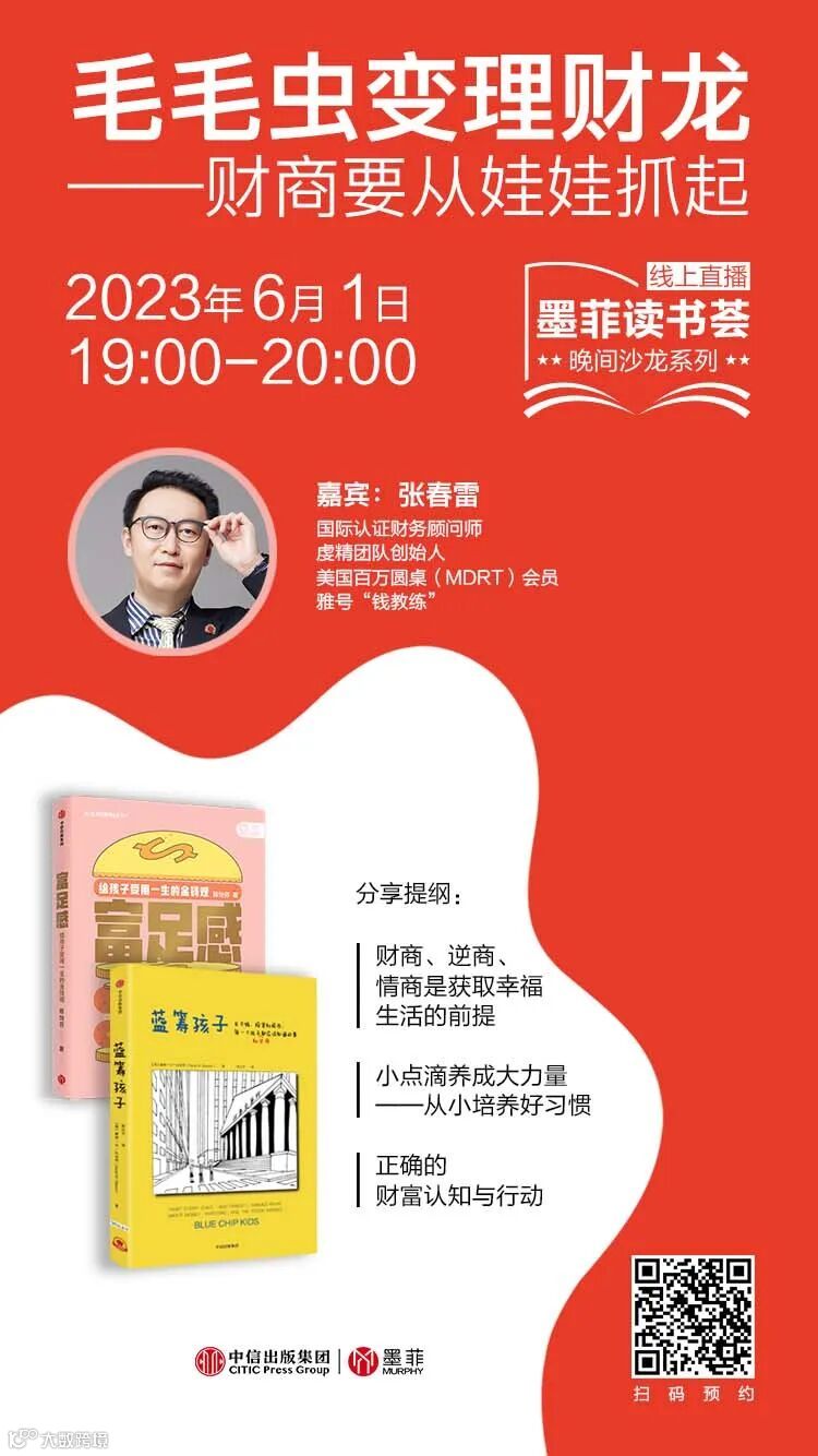 六一儿童节即将来临,中信出版墨菲特别邀请国际认证财务顾问师、美国百万圆桌(MDRT)会员、雅号“钱教练”的张春雷先生,以《毛毛虫变理财龙——财商要从娃娃抓起》为题,与大家共同探讨孩子的财商教育问题,为孩子们送上一份特殊的礼物。欢迎扫码参与。