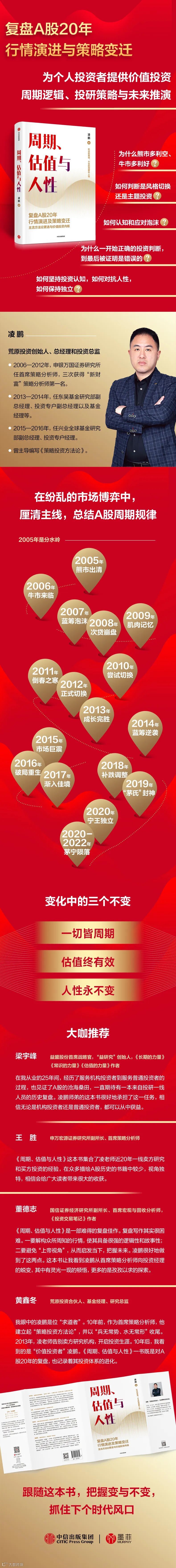 过去30年,A股以2005年为界,之前是“蛮荒年代”,之后步入“现代社会”,所以本书以2005年为起点复盘之后17年的历史。这17年又分为三个阶段:2005—2009年的“周期为王”,2010—2015年的“成长致胜”和 2016—2022年的“茅宁共舞”。这三个阶段非但主角不同,连方法论都有差异,但当中又透着不变的共性。本书共五章,采取总—分—总的模式:第一章先论述为什么选择 2005年作为起点、2005年之前的A股和2005年之后的A股;第二章复盘 2005—2009年的行情,主流的方法论是“投资时钟”;第三章复盘2010—2015年的行情,主流的方法论是“互联网思维”;第四章复盘 2016—2022年的行情,投资者摒弃行业之分,唯龙头是举。第五章总结了过去17年不变的规律,分别是周期、估值和人性。说来也巧,第二章至第四章几乎对应我职业生涯的三个阶段:“周期为王”的年代我在申万打造体系,“成长致胜”的5年我在两家公募机构任职,“茅宁共舞”时期我已经出来创业,在每个阶段都有各自的探索和沉淀,冷暖自知。