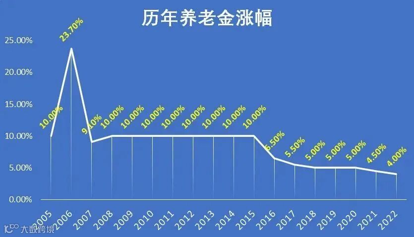 2016年开始,调整比例开始逐渐下滑:2016年为6.5%,2017年为5.5%,2018年开始连续3年为5%,2021年为4.5%,2022年为4%。
