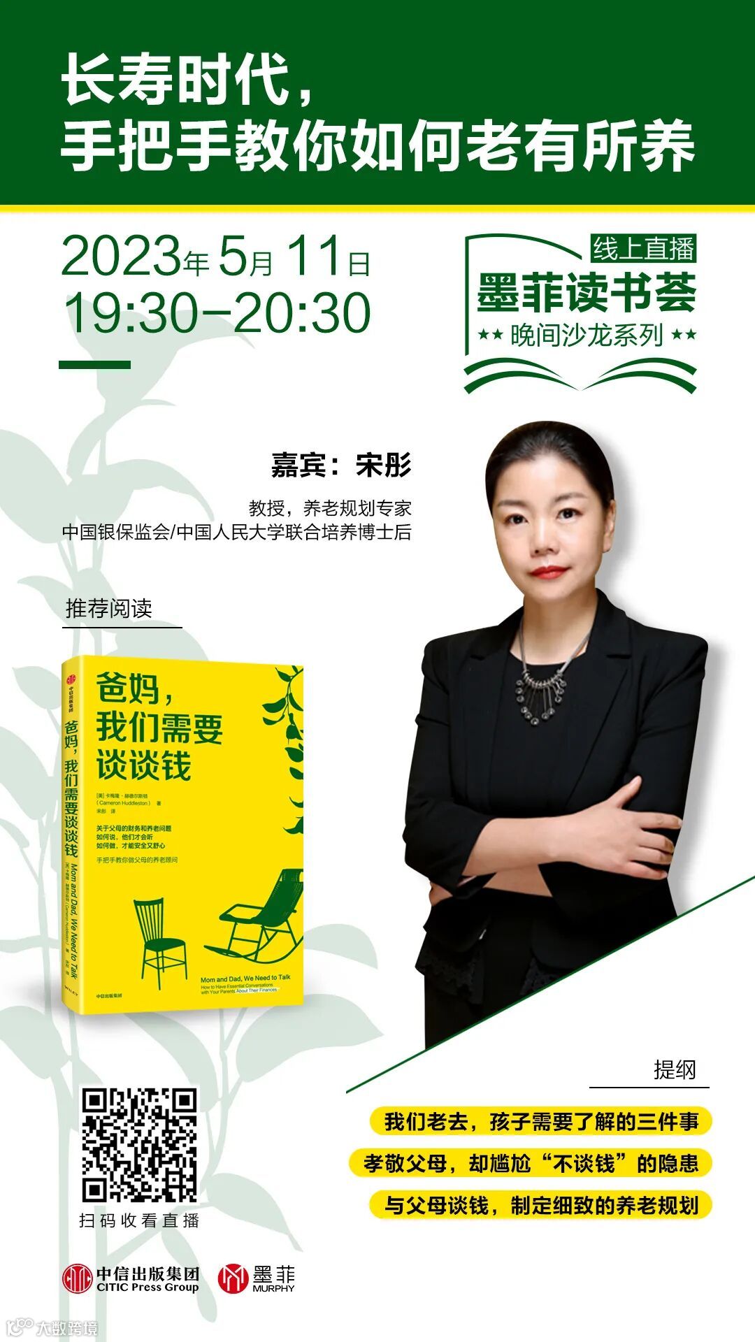 5月11日晚7点半,养老规划专家宋彤教授将做客中信出版墨菲读书荟,以《长寿时代,手把手教你如何老有所养》为题,与大家进行一场温情对话,并对上述问题进行分享,助力我们人人成为养老专家,让自己和父母都高质量生活,老有所养。欢迎扫码参与。