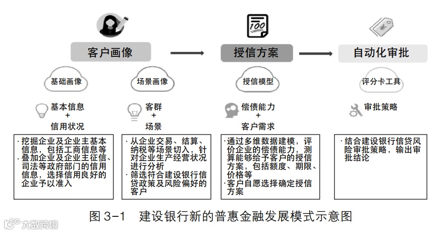 同时,通过连接外部渠道,将各类外部数据转化为内部通用的数据字典,构建企业级的数据管理体系,形成了以人行征信、纳税、公积金、投标等政府及公共事业类数据为基础,应收账款、电商交易等特色场景类数据为补充的外部数据库。通过内外部场景建立数字连接,整合了近6亿条客户信息,进行目标市场模型的逻辑分析与转换,对企业进行立体 “画像”,以此判断企业经营情况。在此基础上,形成了新的普惠金融发展模式 (见图 3-1)。该模式特点如下。
