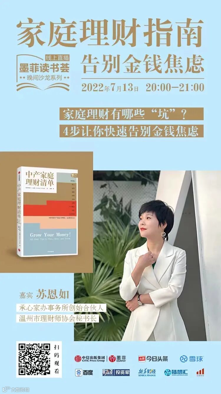 7月13日晚8点,我们特邀资深理财顾问苏恩如做客直播间为我们领读,与大家聊聊现代家庭如何做好理财规划。扫描下图中二维码观看~