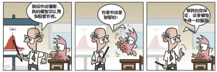 正常情况下,这个分布是符合“正态分布”的规律的,一系列统计学的结论和成果都是在正态分布的情况下推导得出的。但金融市场并不符合正态分布的薄尾特征,它是肥尾的。也就是发生极端暴涨和暴跌的概率远大于正态分布所描述的那样,于是一系列我们常见的结论和成果并不适用于金融市场。可学界依然不管不顾的做出了很多并没有实用意义的推导和所谓“成果”。也就是下面漫画要讽刺的。