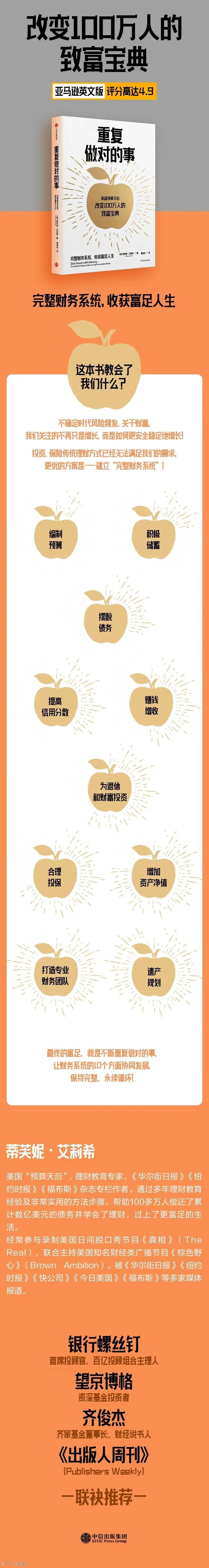 我会在后面进一步解释这个概念,但现在大家需要知道的是,财务完整意味着你在财务生活的10个基本方面均有条不紊,你清醒地知道自己当前所处的位置,也明白距离自己最“疯狂”的梦想还有多远。不管你现在的收入、存款、债务或信用分数如何,你都可以实现财务完整!即便你现在处于财务困境,即便你失去了工作,被高超的骗子骗得债台高筑,你也能像我一样,善用金钱,拥有财务完整的人生。相信我,我就是最好的例子!