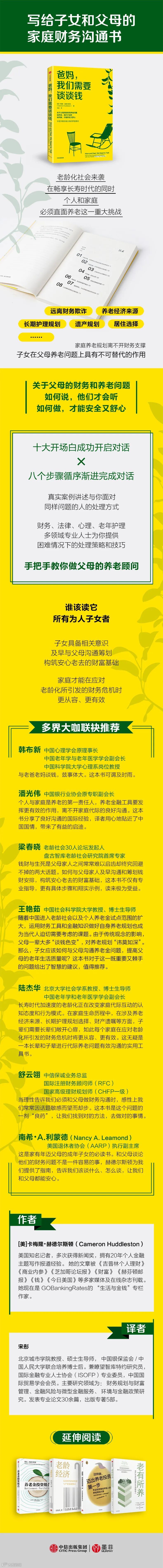 请注意!这本书并不是教我们如何去为父母制定养老规划的,而是要让我们尽早认识到与父母开启关于他们晚年财务问题的谈话的重要性。