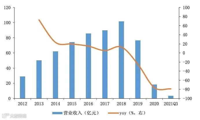 3)公司的重资产模式使其需要投入大量资金,2014年至2018年累计资本开支达38亿元,所以公司需要不断融资,带来的问题就是债务高企,2019年资产负债率为86%,2020年更是高达120%。同时,公司从2018年开始便一直处于亏损状态,截至2021年前3季度公司账上的货币资金只有不到2亿元,前3季度公司经营活动现金流净额仅为0.4亿元,公司或已陷入资不抵债的境地!