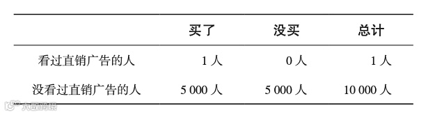 假设看过直销广告的人只有1位,而这个人也确实买了空调。另一方面,没看过直销广告的人则多达1万人,且其中有5000人购买了空调。如果有人因此主张说 “看过广告的人 100% 都购买了本公司的空调”,就感觉挺不靠谱的。看过直销广告的人100%都购买了本公司的空调,事实上就是下表所反映的。