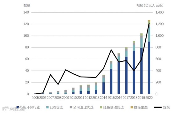 截至2020年10月末,国内共有13家公募基金签署联合国负责任投资原则,2020年泛ESG公募基金127只,资产规模超过1200亿元人民币,约占市场股票型和混合型基金的2.16%。虽然占比较小,但从发展趋势来看,它的增速是非常快的。