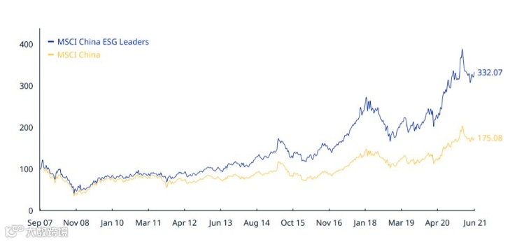 在国内,ESG也是可以获得超额收益的。如上图,截止2021年6月底,2012年以来MSCI中国ESG领先指数年化收益率为16.1%,达到了基准指数的2倍。ESG指数投资确实获得了超额收益。