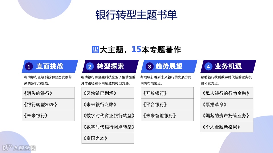 基于上述四大挑战,中信出版墨菲工作室特别推出银行转型主题书单,四大主题,15本专题著作来助力银行机构把握趋势,积极探索和实践转型之路。