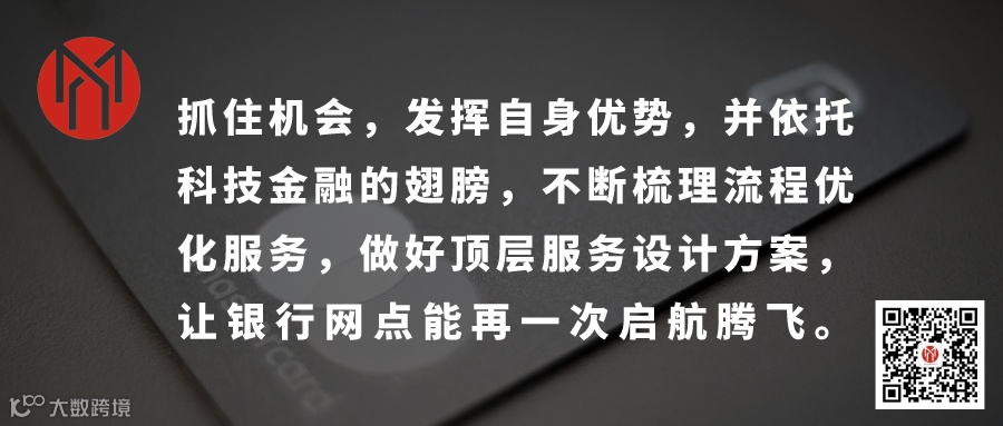 抓住机会,发挥银行自身的优势,并依托科技金融的翅膀,不断梳理流程优化服务,做好顶层服务设计方案,让银行网点能再一次启航并腾飞。