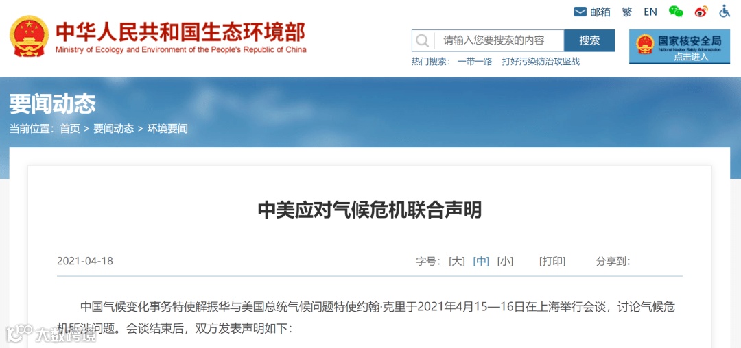 4月15日至16日,中美双方气候变化事务特使就全球气候问题进行了讨论,随后发布了《中美应对气候危机联合声明》。该声明表示中美将致力于相互合作并与其他国家一道解决气候危机。