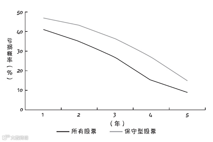 真正的好消息是:保守型股票的亏损概率更低!如图3所示,在1年、3年和5年的投资期内,保守型股票投资组合的亏损概率分别从41%(1年)下降至27%(3年),再降到9%(5年)。