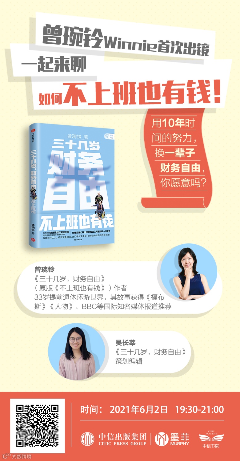 中信出版墨菲特邀《三十几岁,财务自由》作者曾琬铃以及该书策划编辑吴长莘为我们进行精彩分享——“如何不上班也有钱”。