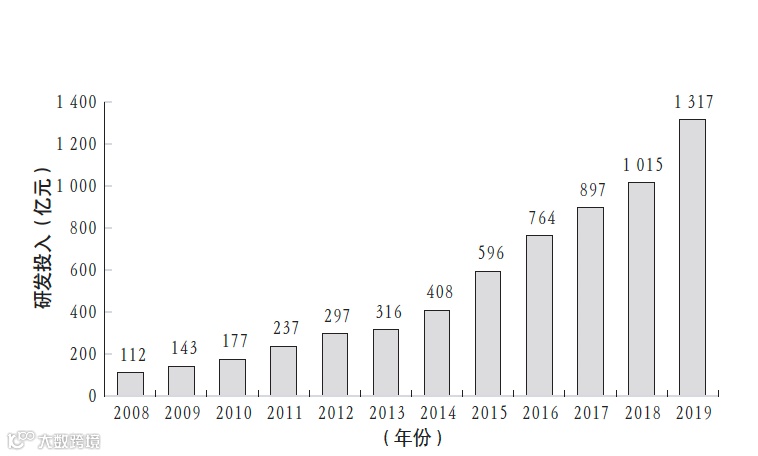 2008年,华为的研发投入为112 亿元,之后不断攀升,2019年更是达到创纪录的1317亿元。