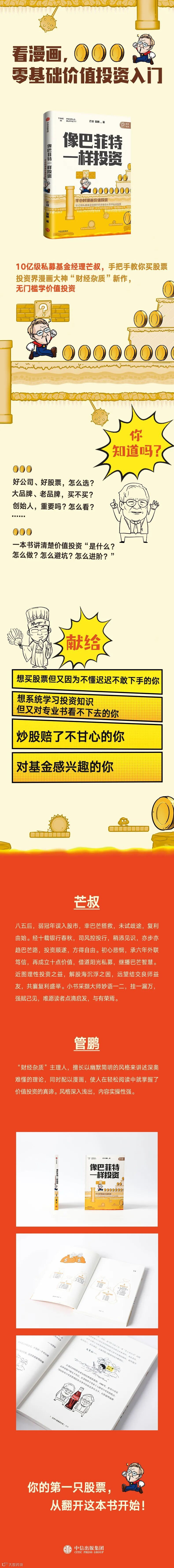 这是目前价值投资专业书中唯一的漫画书,内容涵盖了价值投资几乎所有的核心理念,看完消化掉,足够你受用一生。建议多读几遍,每读一遍你都会有新的认识,也可以放在床头,时不时翻一翻,它将成为你一生的朋友!