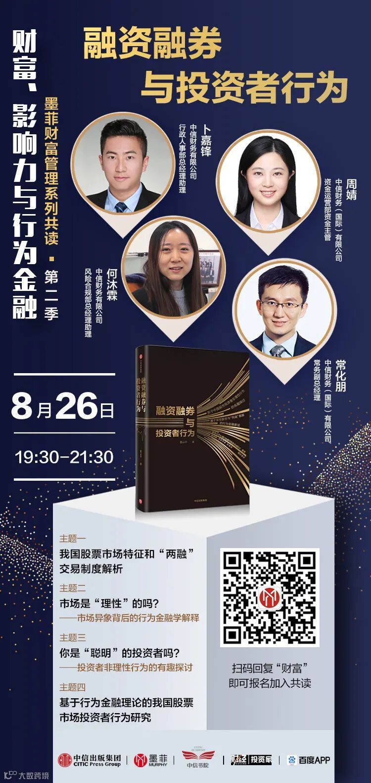 8月26日19:30,中信出版墨菲在墨菲财富管理系列共读第二季中为大家解读《融资融劵与投资者行为》。