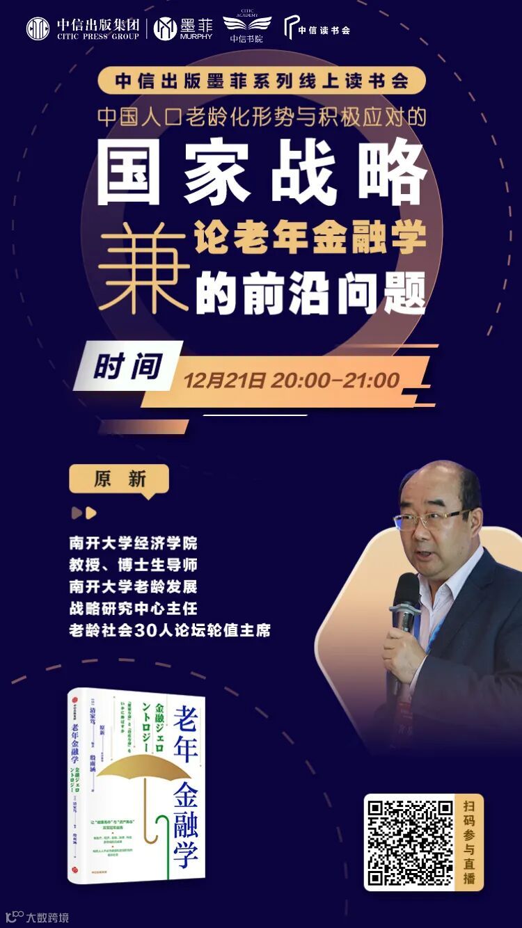 中信出版墨菲特邀南开大学教授、博士生导师原新老师为我们分享《中国人口老龄化形势与积极应对的国家战略——兼论老年金融学的前沿问题》。