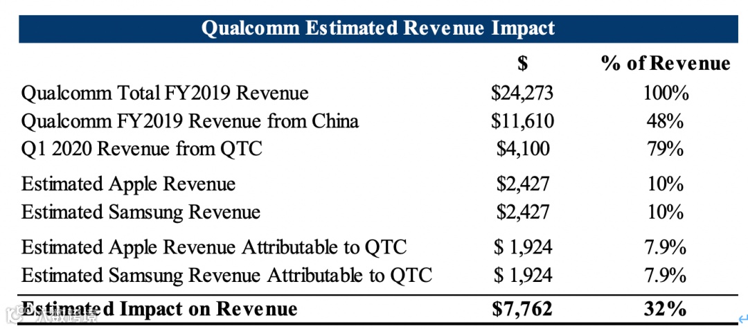 假设高通向OPPO,vivo和小米的销售都受到影响,高通的收入可能损失超过20%,这些收入无法从华为那里补回来。