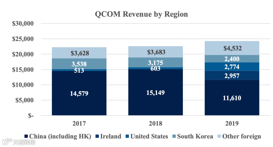 在2019财年,对中国的销售量约占高通总收入的49%,这其中它包括了在中国制造但未在中国国内销售的销售量。
