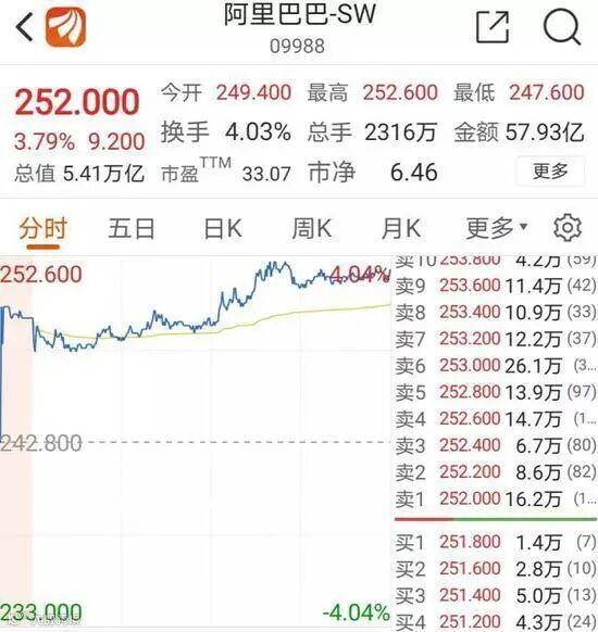 不过,这一消息出来之后,港股阿里巴巴-SW午后一度涨逾4%,截至当日收盘涨3.79%达252港元;美股阿里巴巴盘前涨逾1%。