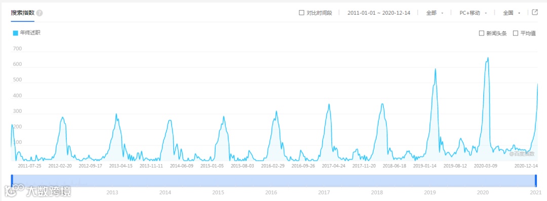 大家的焦虑指数会随着临近年关的节奏变化。就像下面这张百度搜索指数的数据图,一到12月中旬,大家的焦虑就飙到顶峰,而且还在逐年递增。