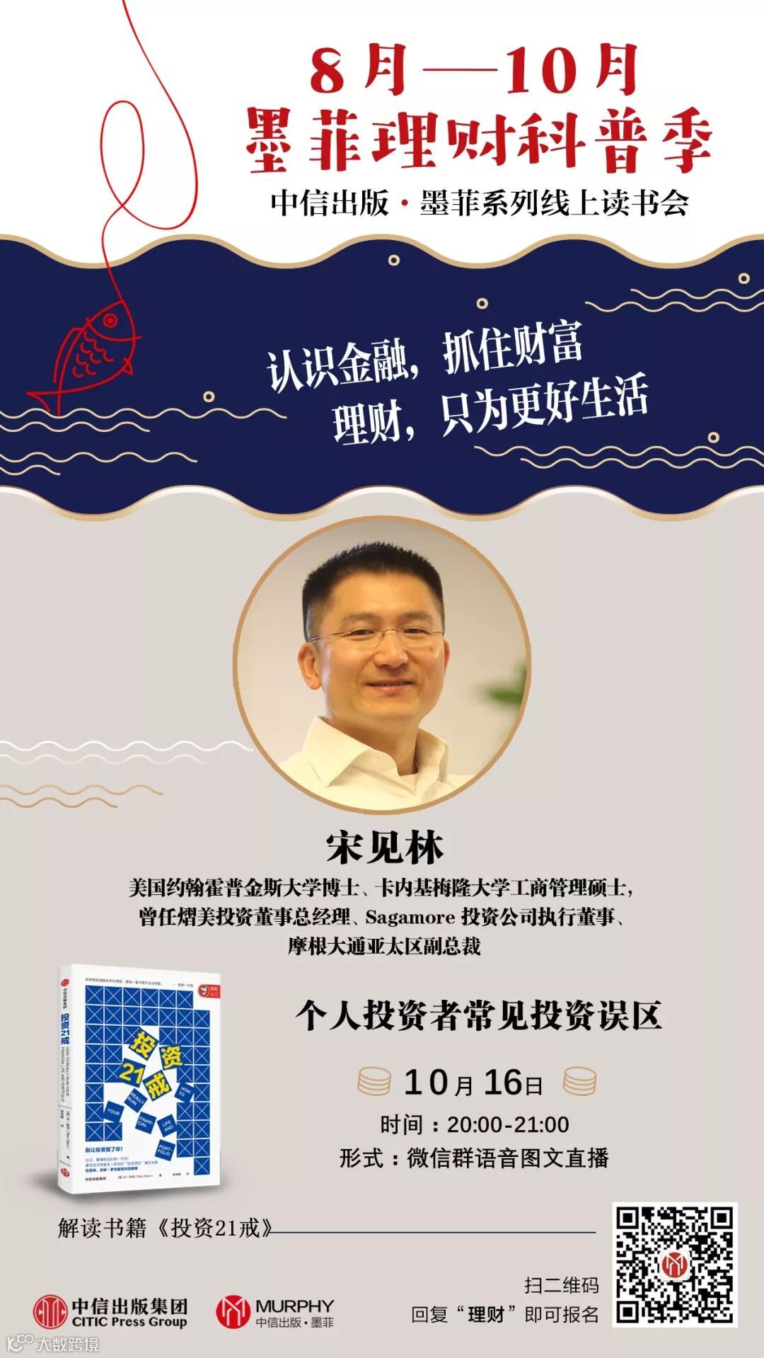 想了解更多投资的常见的误区吗,10月16日,来墨菲读书会,前摩根大通亚太区副总裁宋见林老师为你解读《投资21戒》。