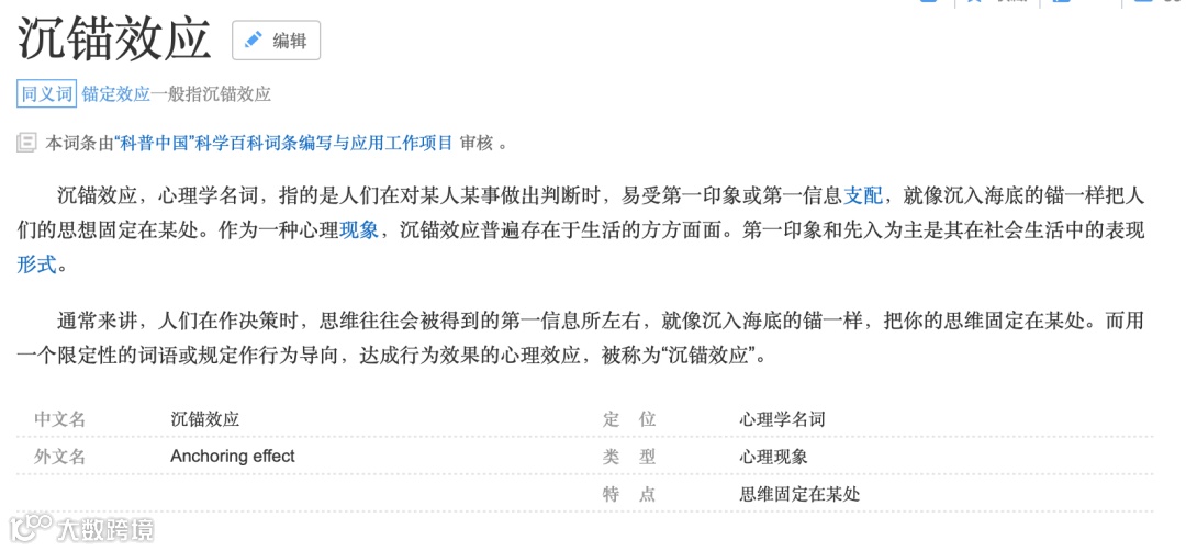 所谓沉锚效应(Anchoring effect)是指当人们需要对某个事件做定量估测时,会将某些特定数值作为起始值,起始值像锚一样制约着估测值。