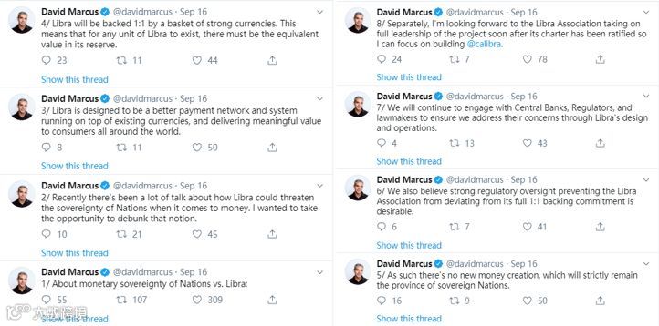 9月16日,针对法国财长Bruno Le Maire提出的“Libra威胁国家主权”的言论,David Marcus连续发布多条推特做出回应,表示在Libra的发行过程中,没有新的货币被创造出来,而是1:1锚定现有法币的价值,所以也不会对国家主权造成威胁。并且强调Libra团队将持续与央行、监管机构及立法机构沟通,以解决它们的担忧。