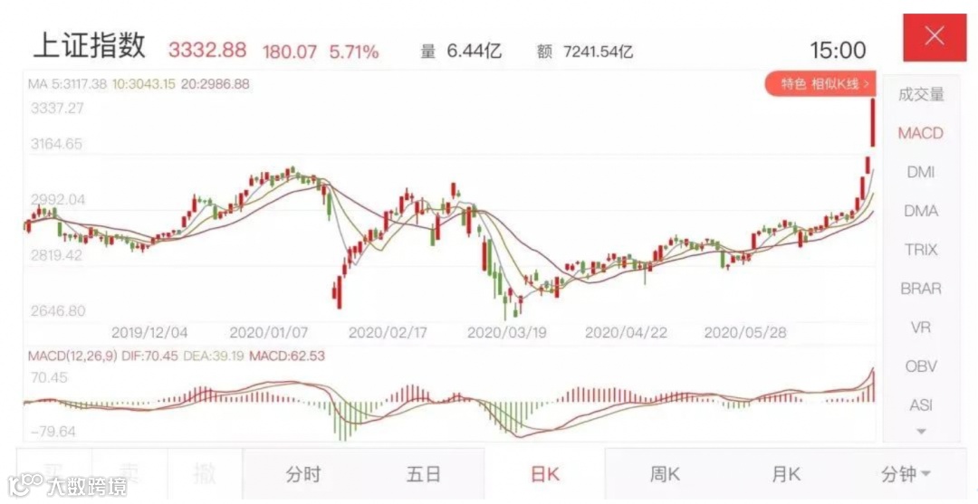 7月6日,A股市场更是走出了“疯牛”的气魄。当人们还在担心A股能否冲破3300关卡之时,沪指一日之间攻下3200点,踏上3300点。大盘收涨近5.71%,创5年最大单日涨幅。