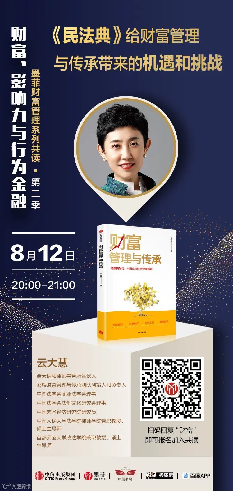 8月12日 20:00-21:00,第二期,由浩天信和律师事务所合伙人云大慧老师,为大家分享:《民法典》给财富管理与传承带来的机遇与挑战。
