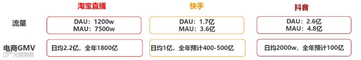 目前,在直播带货行业,已经呈现出淘宝、快手、抖音“三国鼎立“的局面。根据招商证券2020年1月发布的报告数据显示,淘宝直播的电商GMV独占鳌头,日均达到2.2亿,全年1800亿;快手的电商日均GMV达到了1亿,抖音则为日均2000万。