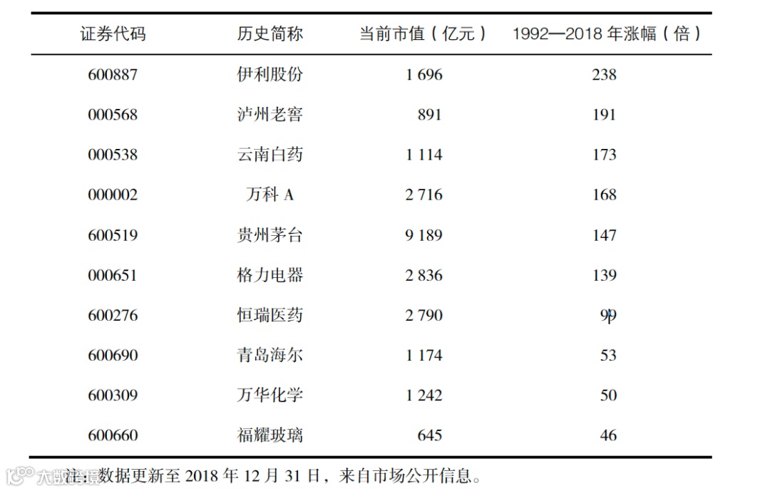 这些超级大牛股的存在说明我国A 股市场不仅在整体上、指数上有投资价值,在个股方面,也能产生很多可以媲美可口可乐这样的优质股。