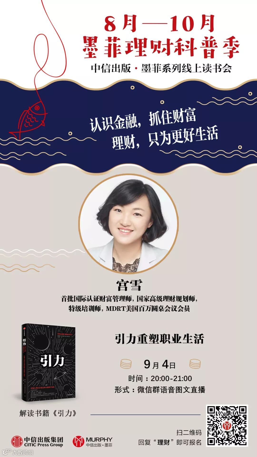 2019年9月4日,中信出版墨菲特邀首批国际认证财富管路师、资深保险顾问宫雪为你分享引力重塑职业生活。