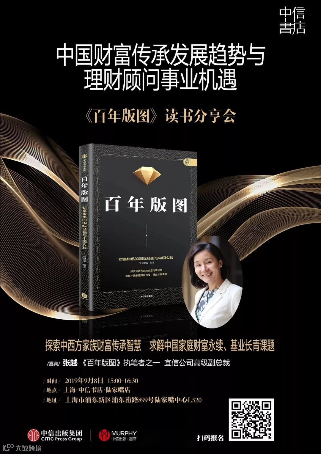 2019年9月8日,中信出版墨菲特邀《百年版图》主要执笔人之一、宜信公司高级副总裁张越做客中信书店(上海陆家嘴店),为你分享中国财富传承发展趋势与理财顾问事业机遇。