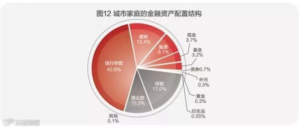 而在我国城市家庭的金融资产中,又以银行存款最多,占比达到了42.9%,其次为理财产品,占比为13.4%,股票占比为8.1%;基金为3.2%;债券仅为0.7%。