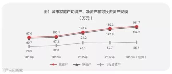 报告测算,2018年中国城市家庭户均总资产规模为161.7万元,户均净资产规模为154.2万元,户均可投资资产规模为55.7万元。