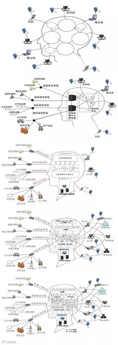 如果用文字描述互联网大脑模型,那么它的定义是这样的:互联网大脑实在互联网向与人类大脑高度相似的方向进化的过程中形成的类脑巨系统架构。互联网大脑具备不断成熟的类脑视觉、听觉、感觉、运动、记忆、中枢和自主神经系统。互联网大脑通过类脑神经元网络(大社交网络)将社会各要素(包括但不限于人、AI系统、生产资料、生产工具)和自然各要素(包括但不限于河流、山脉、动物、植物、太空)连接起来,从而实现人与人、人与物、物与物的交互,互联网大脑在云群体智能和云机器智能的驱动下通过云反射弧实现对世界的认知、判断、决策、反馈和改造。