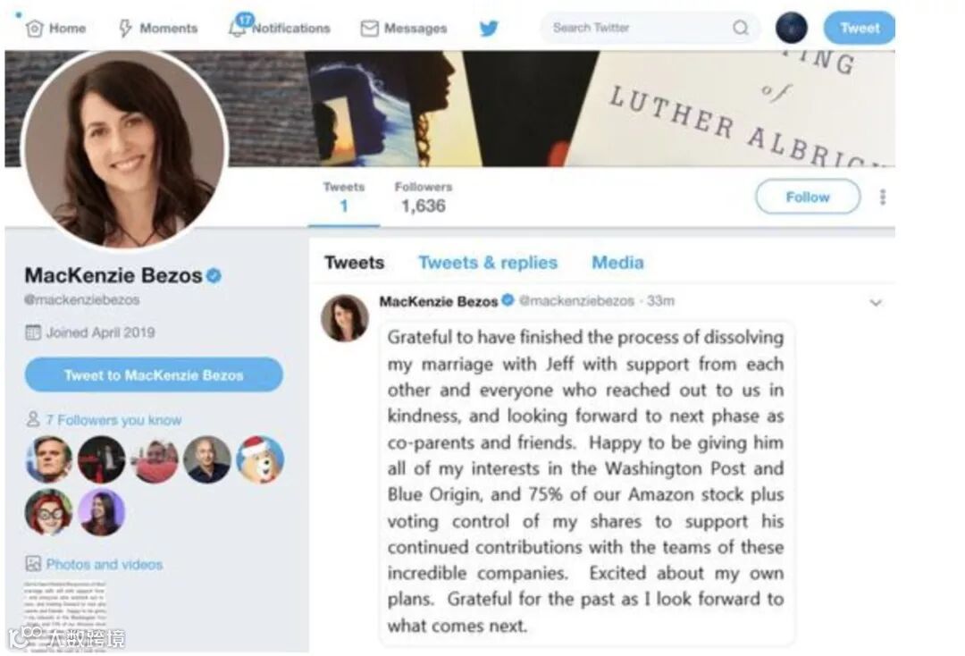 麦肯齐宣布与婚内出轨的世界首富杰夫·贝索斯离婚后,她放弃了《华盛顿邮报》和太空探索公司蓝色起源(Blue Origin)的全部股权(价值40亿美元),只保留两人共同持有的亚马逊股权的1/4,并将所有股权的投票权也授予贝索斯,以支持他继续领导这些公司。