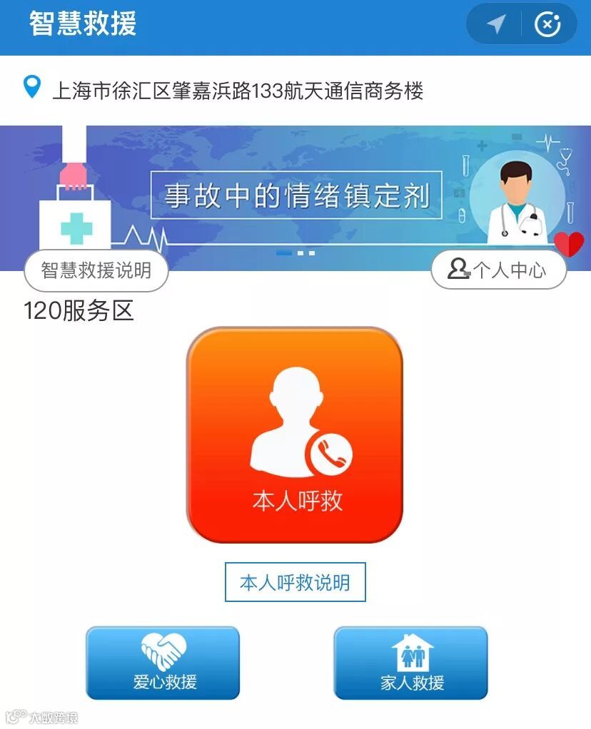 打开它,点击正中间的呼救按钮,就可以一键定位给120,及时向医院求助。