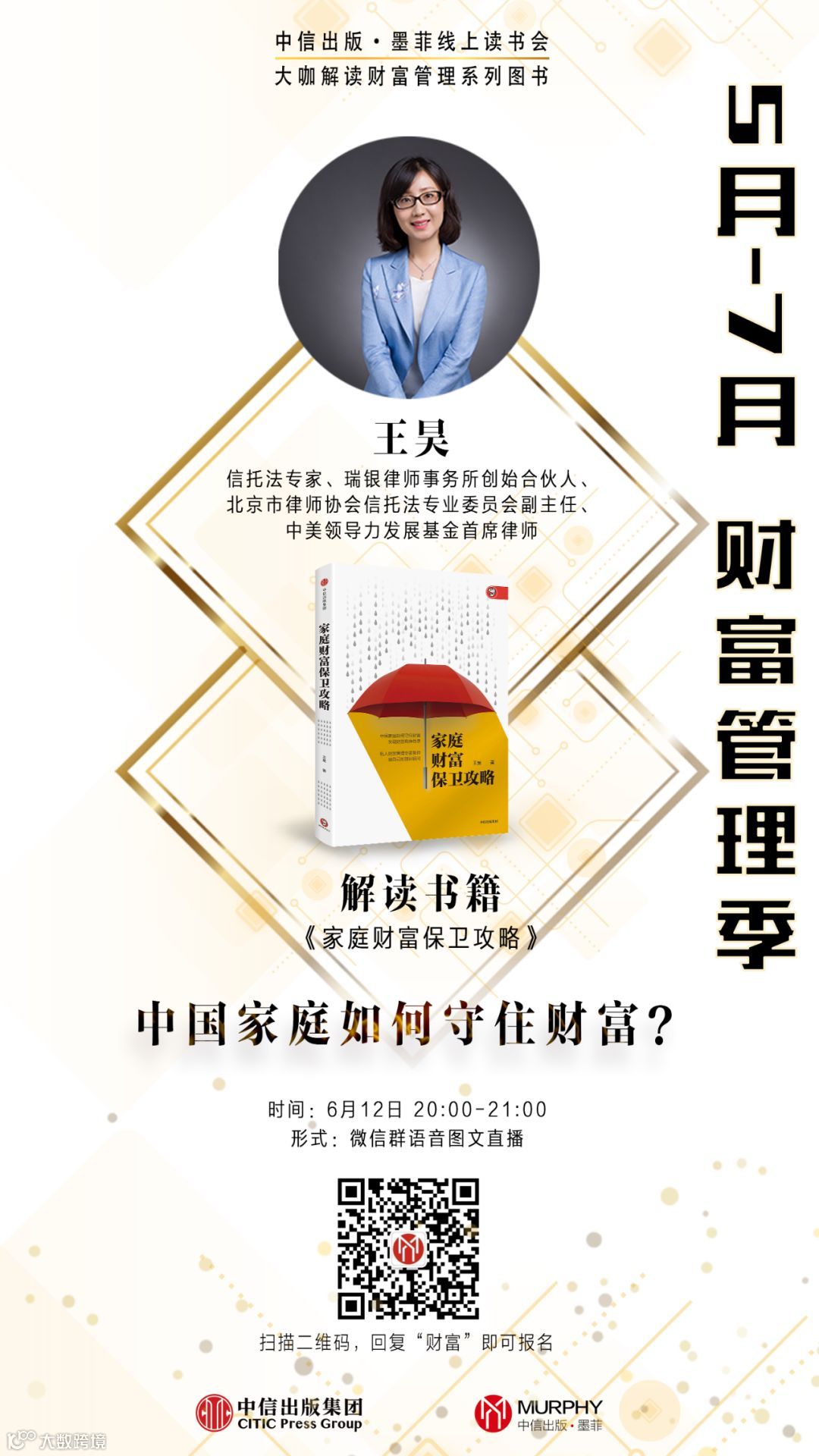 5月-7月,财富管理季,大咖解读财富管理系列图书线上读书会,第五期将在6月12日晚20:00准时开始,我们邀请到了信托法专家、瑞银律师事务所创始合伙人王昊律师为我们解读新书《家庭财富保卫攻略》,她分享的主题是:中国家庭如何守住财富?为你解答这个问题!