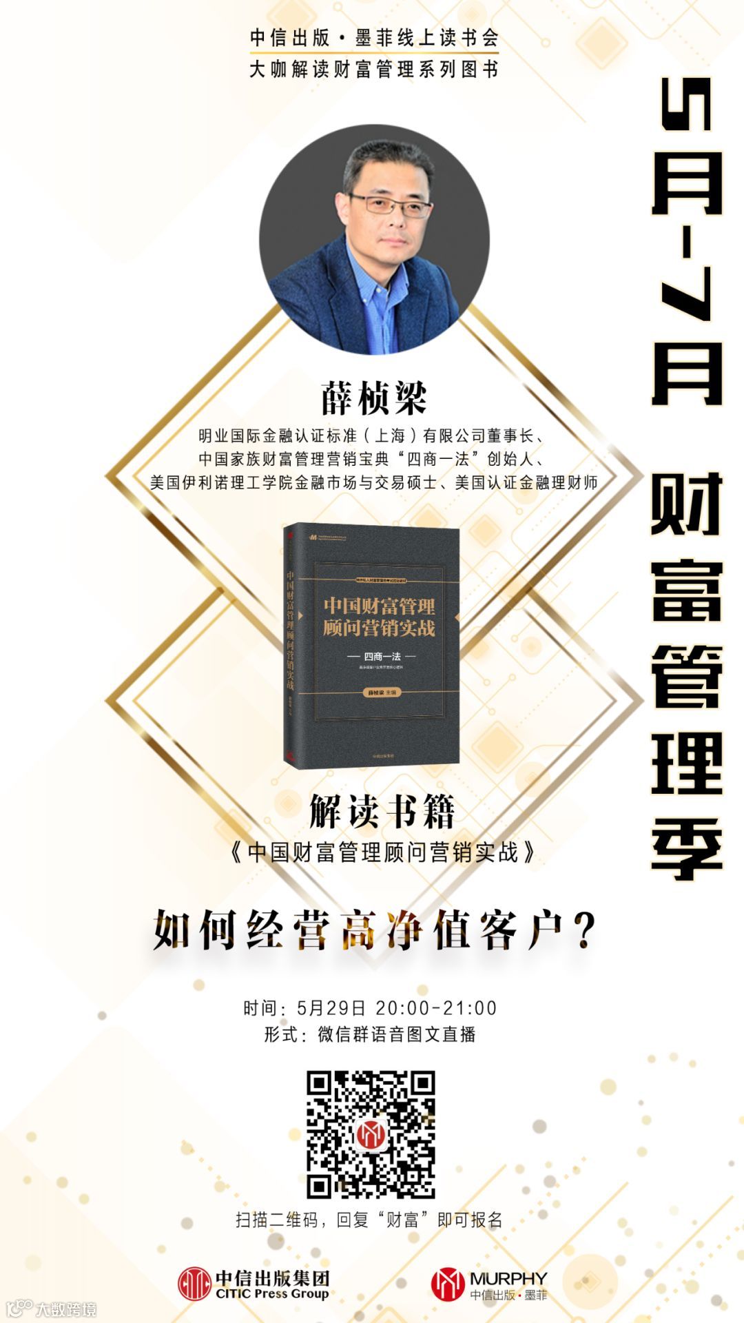 5—7月财富管理季,中信出版·墨菲特别邀请各领域大咖解读财富管理系列好书,共话“新市场、新监管,私人财富解决方案,理财顾问事业新机”。活动详情和报名方式详见海报。