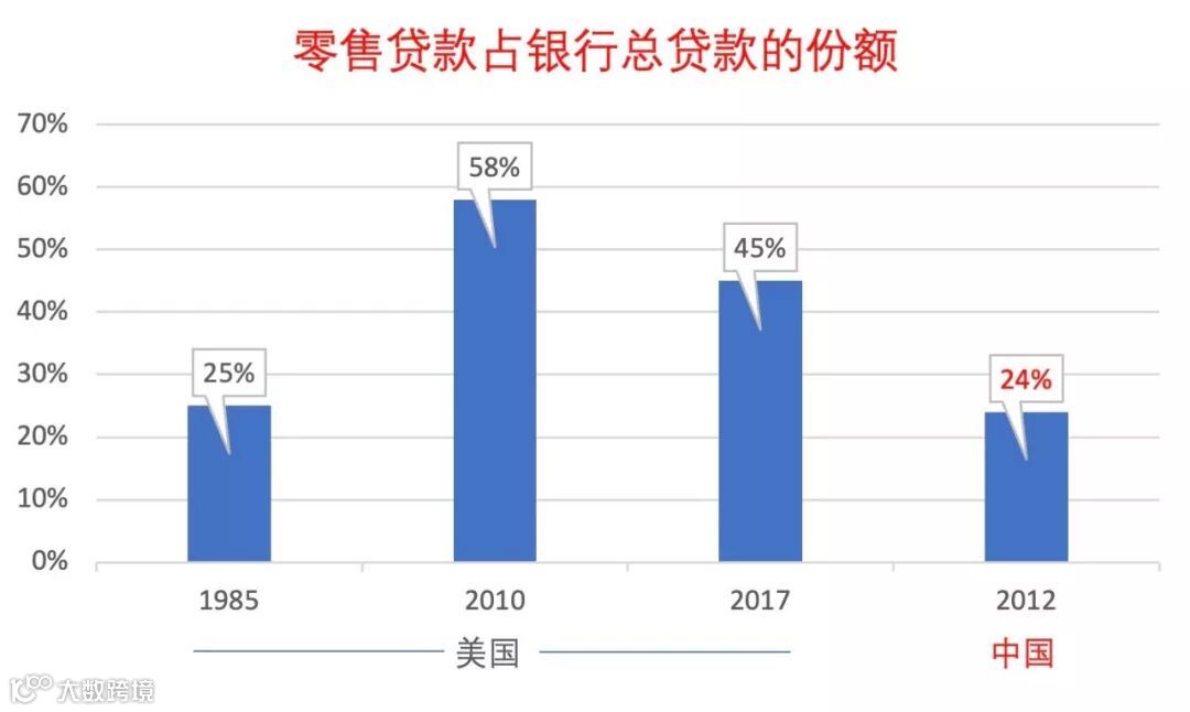 但是随着接下来利率市场化等改革步伐的加快,同时美国制造业的红利逐步消耗殆尽,基础设施建设陷入停滞,美国的银行业进入了艰难的调整期。这一时期,美国银行机构的数量从1985年的约18000家急剧减少到2017年的5607家,而生存下来并成功发展的银行大都经历了一个由大客户为重心的经营模式向零售转型的过程。如下图所见,美国银行业的零售贷款占比从1985年的25%飙升至2010年的58%,即便金融危机后美国家庭债务经历一波惨烈的“去杠杆”,2017年占比仍然达到45%,值得注意的是,美国的零售贷款中还不包含被大量证券化出表的住房按揭贷款。而中国利率市场化提速进程中的2012年,银行业零售贷款占比约为24%,正与美国利率市场化提速进程中的1985年比率相当,其后,中国银行业也迎来了零售贷款与消费金融发展的热潮。历史不是惊人的巧合,它寓示的是改革的逻辑和转型发展的走势。从这个意义上说,零售贷款比重的提升在国内银行业中尚有很大的空间,而储蓄存款占比和零售业务板块利润占比的情况则高度趋同。