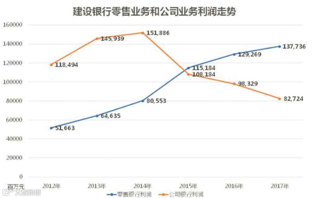 再以建行为例,2012年至今,公司银行业务与零售银行业务利润的此消彼长之势非常明显,足证零售转型是大势所趋。