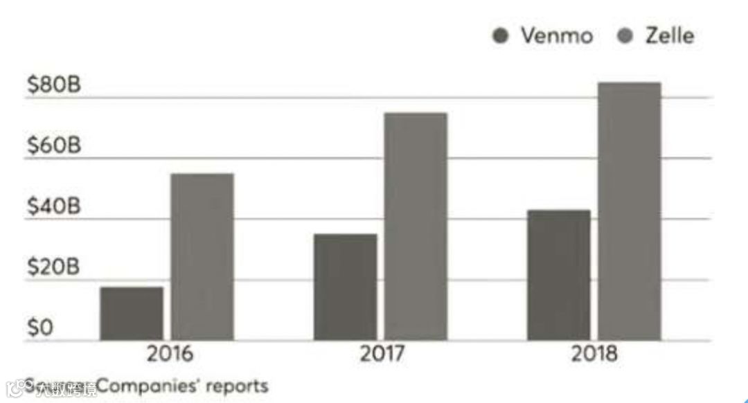 美国银行业在零售业务上的精耕细作、根深蒂固还体现在对金融科技侵袭的成功反击上。富国银行高级副总裁萧兵博士分析,不是美国的金融科技公司不“凶猛”,而是美国的银行业太强悍,没有给第三方金融科技公司掠食和打劫留下太多的机会和太大的空间。以支付为例,国内线上第三方支付基本被微信和支付宝“统治”,而美国科技公司和银行的博弈方兴未艾,从下图银行业的Zelle和科技公司的Venmo比较情况来看,可以说两者势均力敌,银行全无败相。P2P支付尚只是支付的一小部分,而在C2B这块银行业更是牢牢占据优势。美国的银行业认为,支付是重要的阵地,它们“寸土不让”,构筑起了零售银行业务的牢固“城墙”。