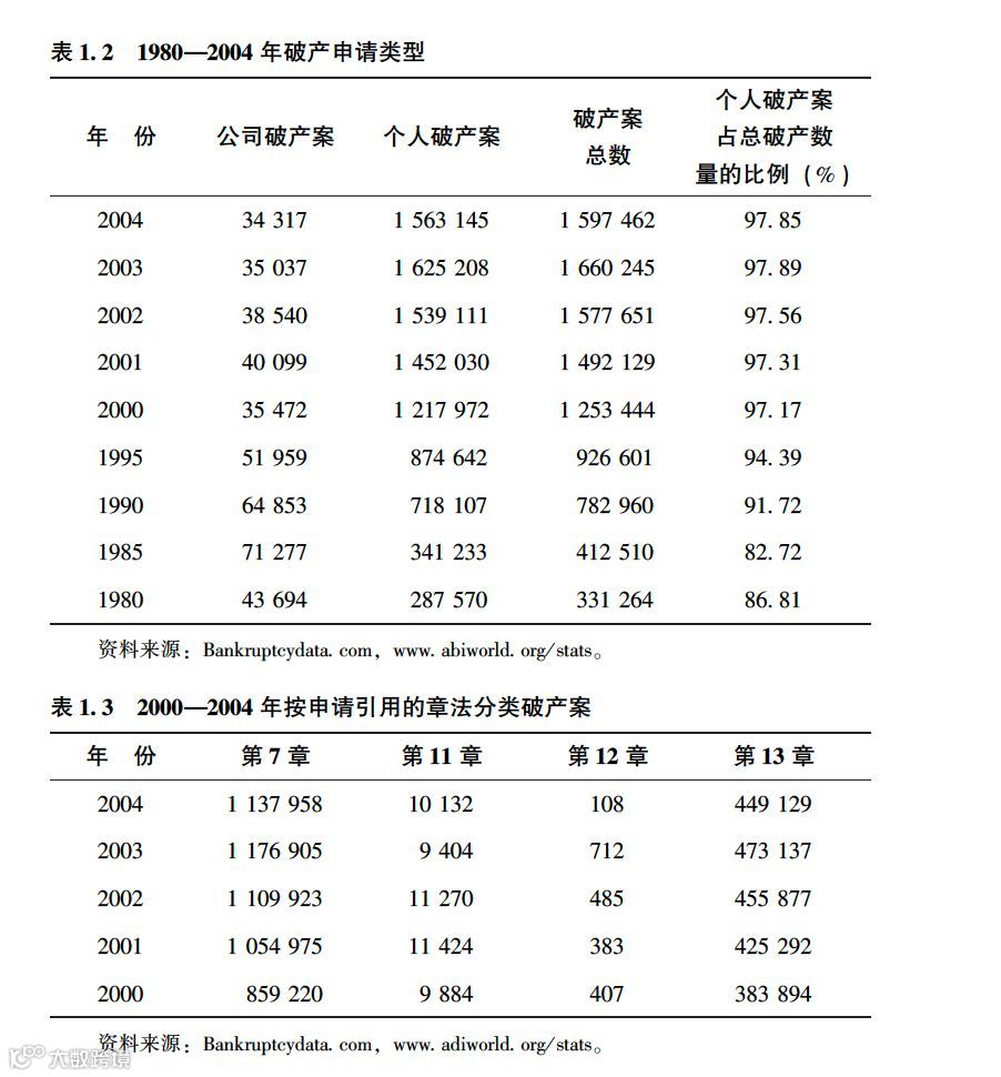 在美国的破产申请主要分为两个大类,即公司破产申请和消费者破产申请。尽管绝大部分破产申请为消费者破产申请,在这些年都接近98%(例如2004年为97.9%),但本书的内容则完全偏向大的商业破产案,即主要是美国破产法中涉及的申请案。表1.2、1.3和图1.1记录了公司和非公司破产申请案的数量情况,我们的重点将放在大公司破产重组的第11章流程处理上。尽管2000—2004年每一年的公司破产数量减少至3.5万~4万个,但申请破产时的负债总金额却有了大幅上涨,尤其是2002年,大约有3 300亿美元的债务规模受到了破产的影响。当然,大量欺诈性的破产案对2001—2002年数据的影响很大。但公正地说,大公司完全可以排除破产的概念已经成为过去时了。