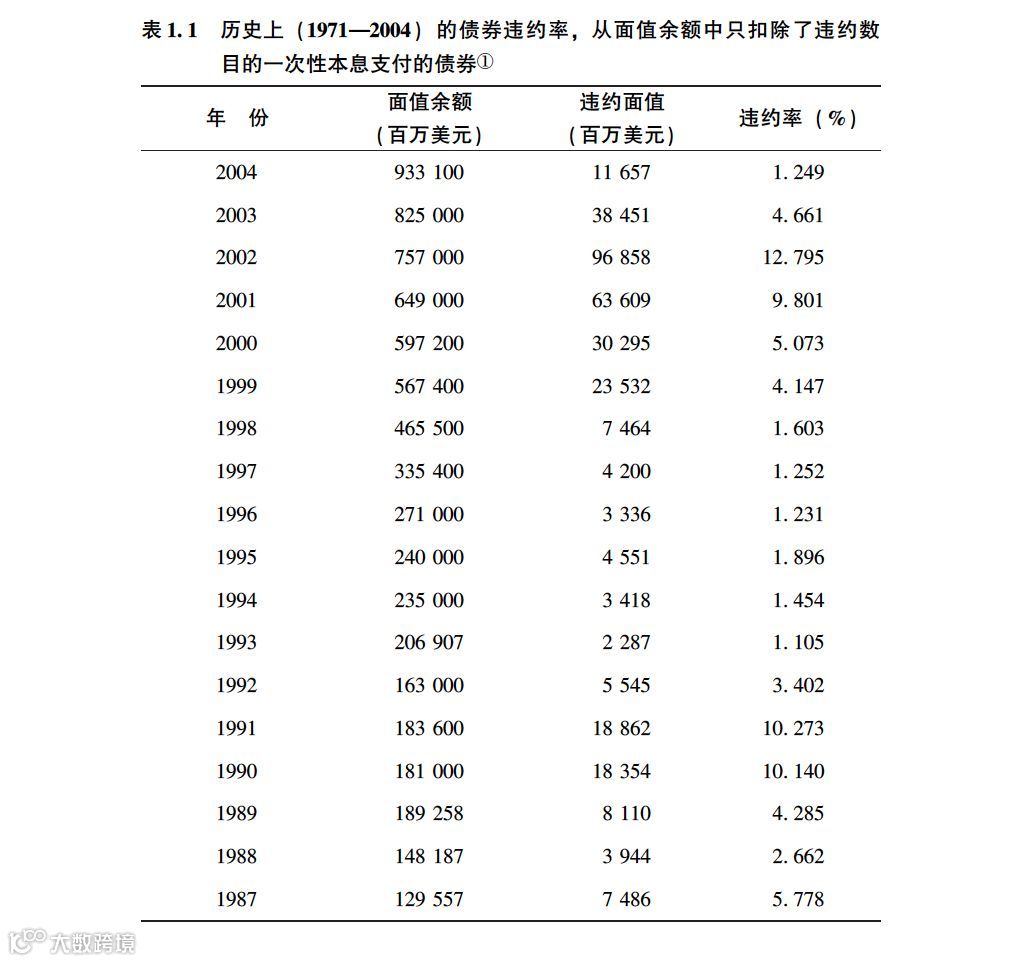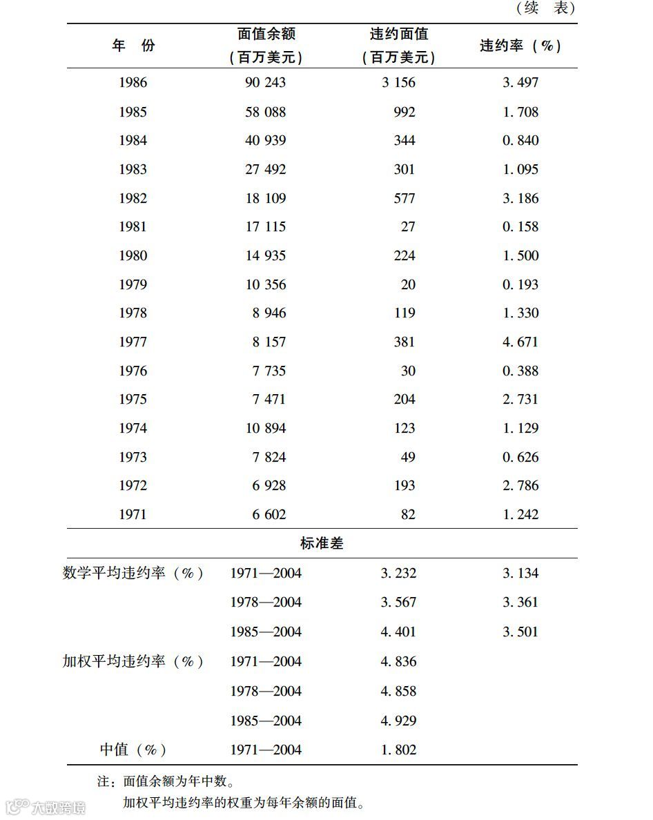 公众持有的债务违约已变成老生常谈,尤其是在1989—1991年和2001—2002年这两段主要的违约年份中。确实,在1990—1991年这两年间,每年的公司债券违约金额达到了180亿美元,涉及约150家公司主体。2002年,债务违约金额更是不可思议地达到了近1 000亿美元的水平。下表1.1显示了1971—2004年美国公共债券违约率的情况,包括违约数和违约金额在高收益债券余额中的比例情况,即所谓的垃圾债券违约比率。违约率计算中也包括了杠杆贷款违约率,这在私人债务市场上相当于投机级债券的违约率。