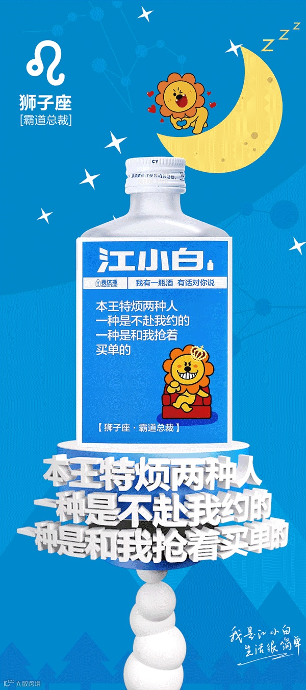 瓶身上写的是: 你若发达了, 别忘了毕业聚餐时你欠我的老醋。“霸道总裁” 狮子座瓶身上写的是: 本王特烦两种人, 一种是不赴我约的人, 另一种是和我抢着买单的人。在江小白看来, 消费者同时也是内容的生产者, 满足表达欲望就是内容。