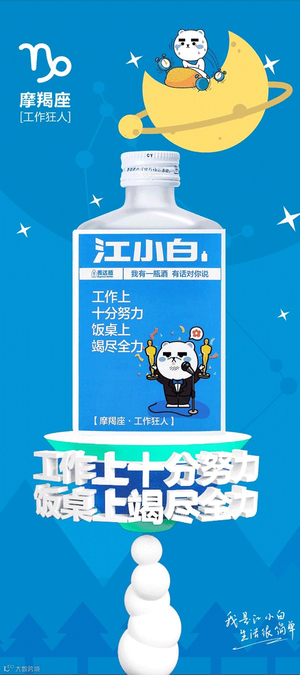 一直以来,江小白都在白酒中都被贴着特立独行的标签,从江小白1.0个性化语录版产品的火爆拉开"江小白"营销现象,到一句"我是江小白,生活很简单",切中了多少奋斗在都市青年落寞、无奈的痛点,再加上《好先生》等影视剧的亲情与友谊场景表达,与独立艺术家打造萌系定制酒,多城巡演的自有独立品牌说唱音乐会等,这样就让江小白和有态度、追求不一样的年轻人紧紧捆绑在一起。而这群人刚好又是星座文化的超级拥趸,那就十分默契地成为了同道大叔的死忠粉,要知道,同道大叔是国内星座文化超级IP,在年轻人中俨然就是星座文化的符号,其2000万+的粉丝群体多是17-27岁的年轻人。由此这次跨界合作自然成为这群粉丝们的狂欢,既契合二者年轻会玩的品牌调性,又同时满足粉丝们的双重喜好,其结果更是星座定制酒一经推出就受到众多粉丝的欢迎,据了解,带有同道大叔IP形象的星座酒特受欢迎,在面市第一个季度,在线下销量突破百万瓶。