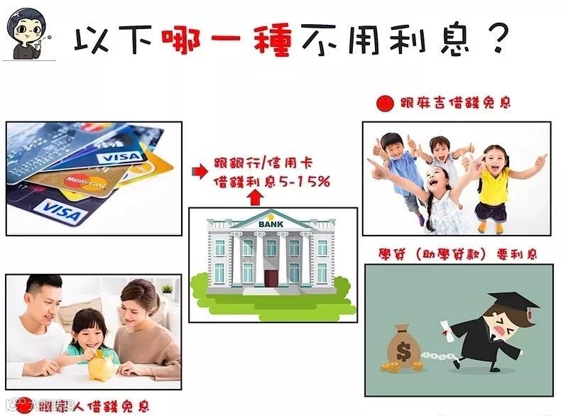 他们的回答很接近答案,通常借钱对象有2FB(Family家人、Friend朋友、Bank银行),前两者可能因为爱跟友谊的关系,愿意无“息”借你钱,但是如果借钱的对象是银行,就必须付利息,他们一分一毫都跟你算得很清楚。